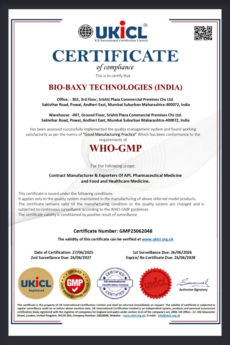 Biobaxy Technologies India (R) is an Creative Multi Group Marketing Company accredited 100% Export Oriented ISO-9001-2015 GMP & FSSAI Certified Company. Established in many part of globe with multiple branch's and retail and wholesale supplies.